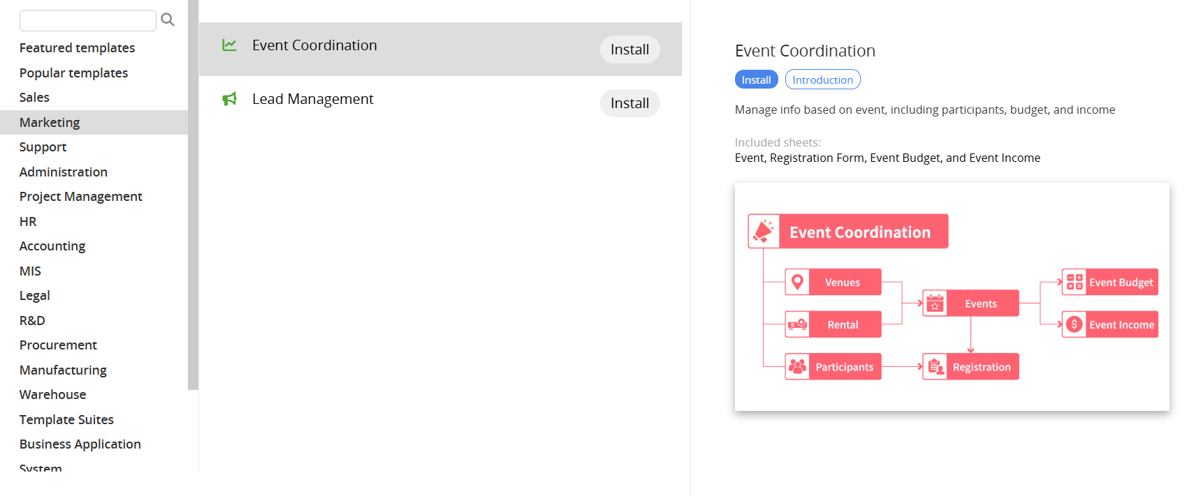 If you are already a Ragic user, you can find the "Event Coordination" template under the "Marketing" category in Install Templates and click "Install" to download it.